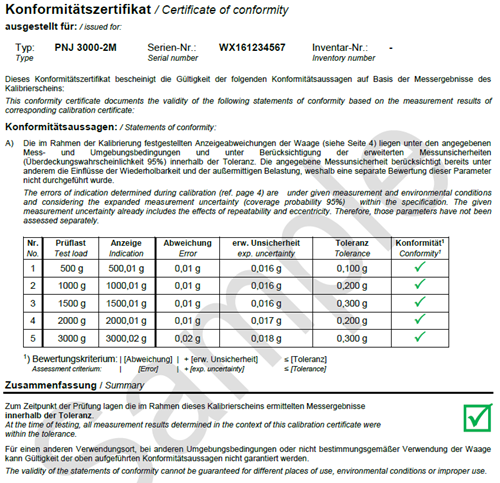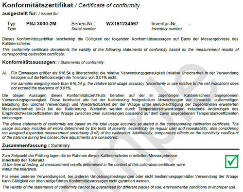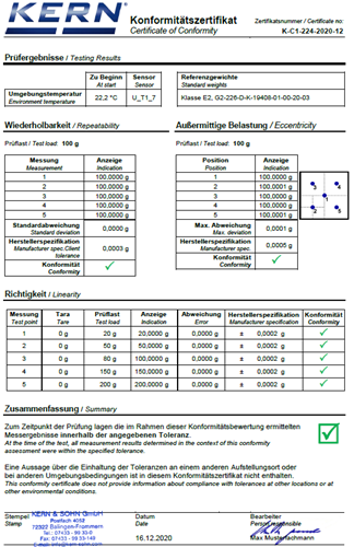| KERN | Option: Évaluation de la conformité sur la base des valeurs mesurées | Exemples de certificats |
