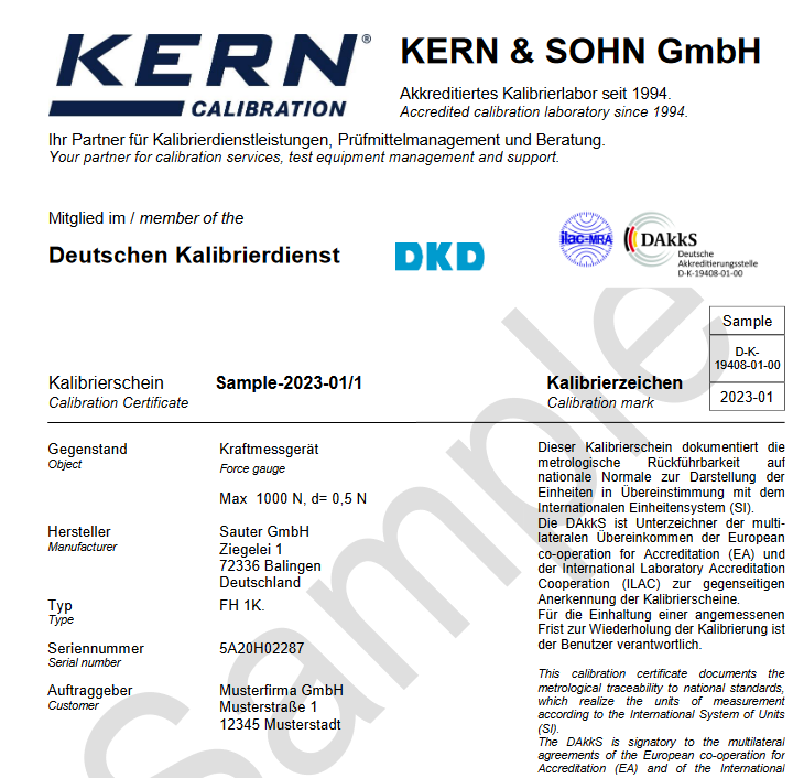 Le laboratoire d’étalonnage DAkkS KERN (D-K-19408-01-00) est accrédité par l’instance d’accréditation du Deutsche Akkreditierungsstelle GmbH (DKD). Le certificat d’étalonnage DAkkS est reconnu à l’international et disponible en plusieurs Langues.