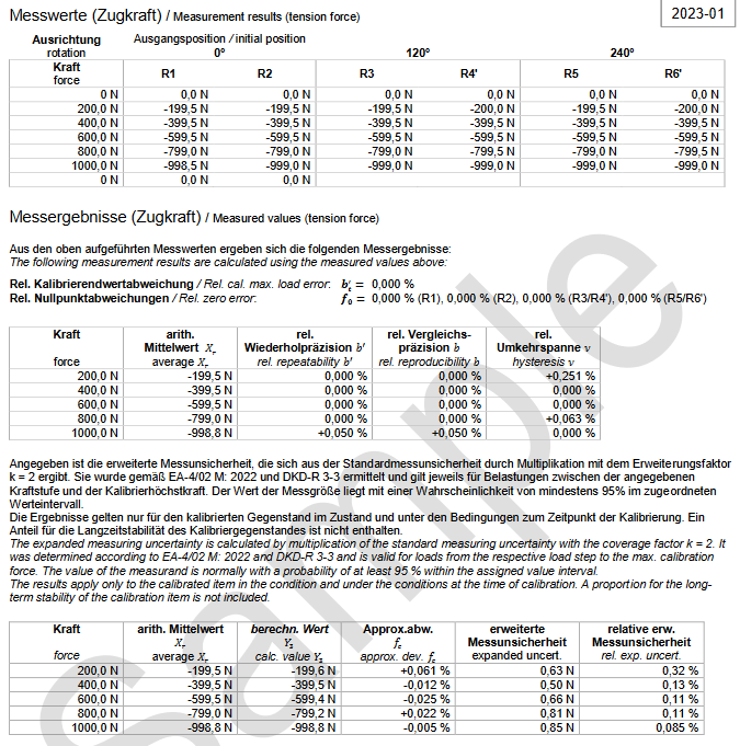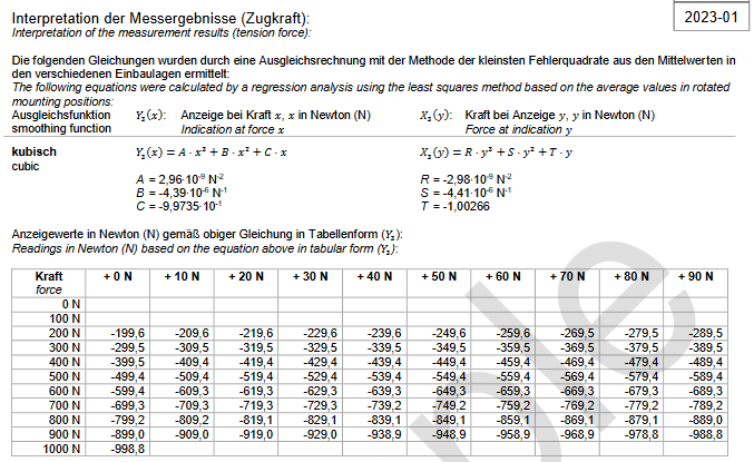 Pour chaque direction de force on va documenter dans cette partie du certificat d’étalonnage les valeurs mesurées „brutes“ enregistrées aupres de l’étalonnage pour que c’est compréhensible. Dépendenant des connaissances préalables concernant l’instrument de mesure ou bien son format et bien sûr les désirs du client des cours divers d’étalonnage peuvent être utilisés. Les cours d’étalonnage sont divers en ce qui concerne nombre et façon des séries de mesure appliquées (en particulier des positions de montage et de charge montant ou descendant) et permettent à adapter l’effort de l’étalonnage aux besoins de précision du client.