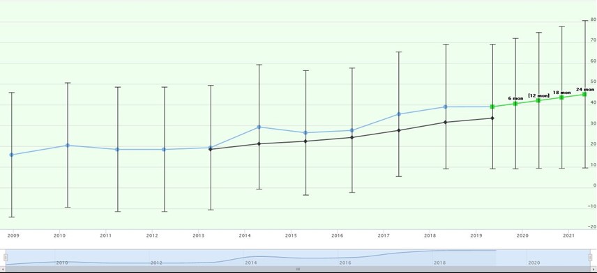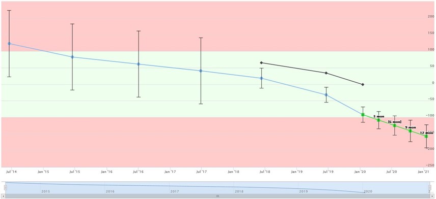 Le graphique ci-dessous montre l'évolution du poids conventionnel d'un poids sur plusieurs années, qui se situe dans les limites de la normale. Vous pouvez également voir une prévision de l'évolution de la valeur du poids conventionnel dans le futur avec la même utilisation.