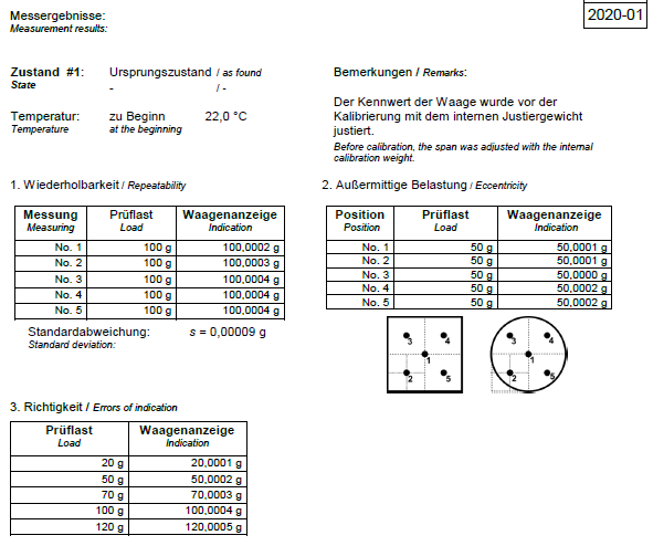 Pour chaque direction de force on va documenter dans cette partie du certificat d’étalonnage les valeurs mesurées „brutes“ enregistrées aupres de l’étalonnage pour que c’est compréhensible. Dépendenant des connaissances préalables concernant l’instrument de mesure ou bien son format et bien sûr les désirs du client des cours divers d’étalonnage peuvent être utilisés. Les cours d’étalonnage sont divers en ce qui concerne nombre et façon des séries de mesure appliquées (en particulier des positions de montage et de charge montant ou descendant) et permettent à adapter l’effort de l’étalonnage aux besoins de précision du client.