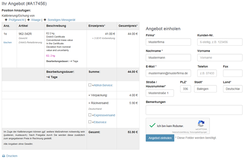No matter if for your weights, balances of other measuring devices - our price quote generator will offer you the appropriate price for any calibration within the range of our accreditition.
