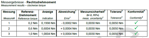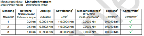 Suivant vous voyez de façon exemplaire un extrait de l'admission de la valeur. Vous pouvez regarder de certificat d'étalonnage d'exemple ici.