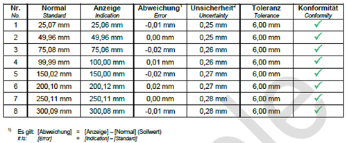 Suivant vous voyez de façon exemplaire un extrait de l'admission de la valeur. Vous pouvez regarder le certificat d'étalonnage d'exemple ici.
